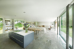 This house is constructed entirely from reinforced concrete and features a cantilevered overhang. Local stone dry walls and larch cladding complement the rural setting of this former quarry site.